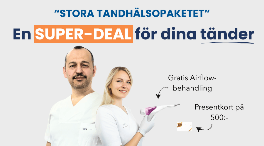 BONUS: AirFlow®-behandling: Bättre än polering, för renare och vitare tänder. Airflow® är en behandling där man använder saltblästring med högtrycksvatten vilket är ett otroligt effektivt och 100% säkert sätt att ta bort ytliga missfärgningar.